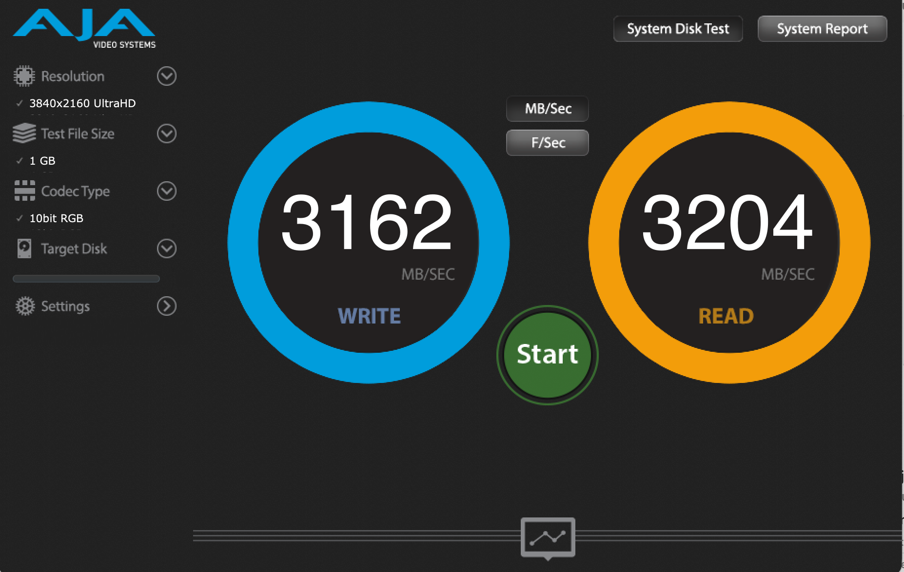 Genau dieses Gefühl hatte ich, als ich die OWC Express 1M2 erstmals an mein MacBook Pro angeschlossen habe. Kurz AJA System Test gestartet – und die Zahlen sprechen für sich: